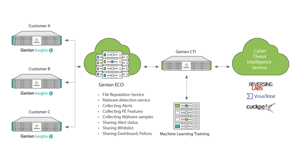 Genians Ekosistemi, Genians müşterilerinin sistemlerinde tespit edilip raporlanan tehdit bilgilerini toplar. Toplanan tüm veriler birleştirilir ve anonim hâle getirilir. İşlenmiş bilgiler ve itibar hizmetleri, diğer müşterilerle tam zamanında paylaşılabilir.