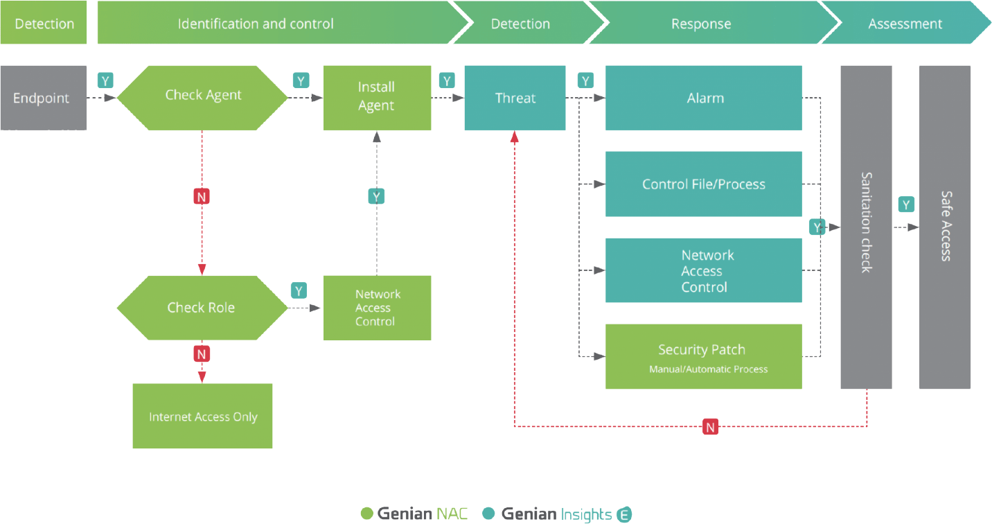 Genian EDR, Genian NAC ile entegre edildiğinde, ağa bağlı tüm cihazları tanımlayıp sınıflandırarak ağ görünürlüğünü artırır. Ayrıca, ajan eylemleri tehditlere daha etkili yanıt verecek şekilde en üst düzeye çıkarılabilir.